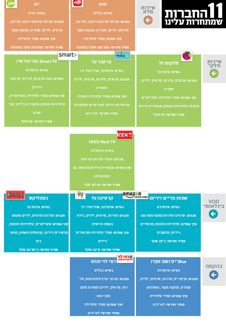 והמגוון גדול. כשירות טלוויזיה מקיף, מלבד הוט ויס, ניתן היום כבר לבחור בשירותי סלקום TV, ומהשבוע גם בפרטנר TV. ארבע החברות הללו, שהן גם ארבע קבוצות התקשורת הגדולות בישראל, יתייצבו מהשבוע על המגרש לקרב גלדיאטורים. כולן יפסידו הון תועפות בטווח הקצר, בשאיפה להגיע לרווחיות בטווח הארוך.
