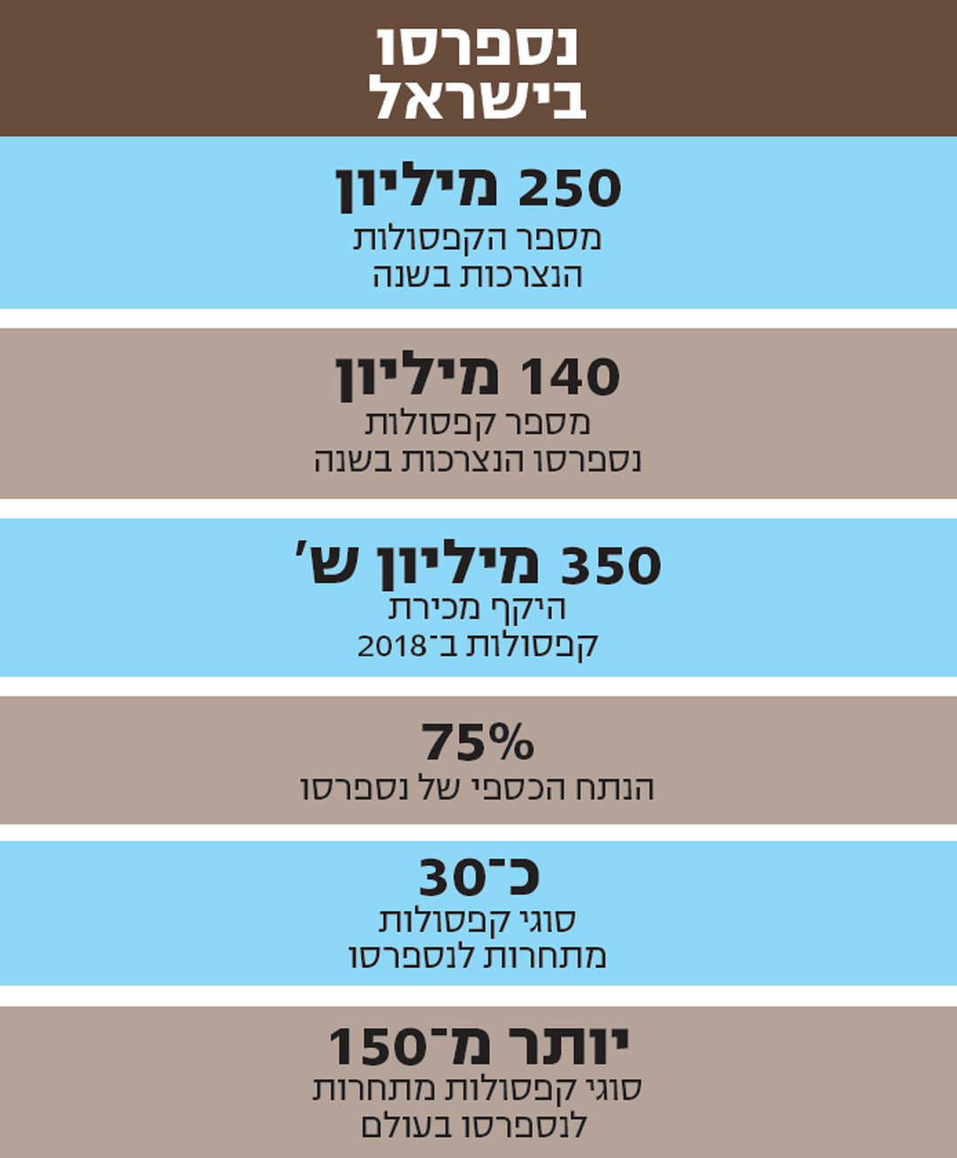 מביני דבר רבים אמנם יעקמו אף ברגשות עליונות כלפי הרעיון של שתיית קפה בקפסולות, אבל בישראל לוגמים כל שנה כרבע מיליארד כוסות קפה כזה. מדובר בשוק של 350 מיליון שקל לשנה, בהערכה צנועה, אך הוא מהווה 8% בלבד משוק הקפה הכללי. עם זאת, הוא עושה המון רעש, ולא במקרה: נספרסו שופכת הרבה כסף על שיווק ופרסום. כך, למשל, ב־2018 הוכתר ג'ורג' קלוני לשחקן המרוויח בעולם למרות שלא שיחק אפילו בסרט אחד באותה שנה, בזכות מכירת מותג הטקילה שלו והשתתפותו בפרסומות הקפה של נספרסו. על פי הערכות, פרסומות החברה הכניסו לו 10־5 מיליוני דולרים בשנה. בישראל השקיעה נספרסו בין 2008 ל־2017 יותר מ־226 מיליון שקל בקידום המותג.