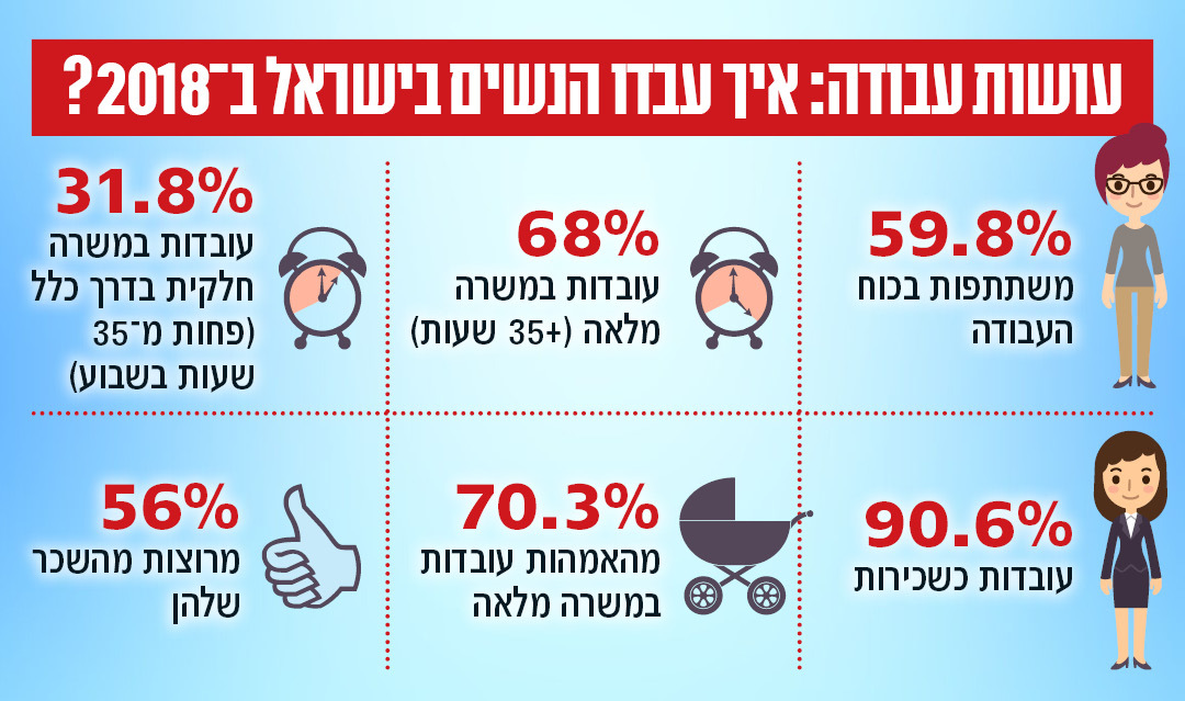 שני שלישים מהנשים בישראל עבדו במשרה מלאה ב־2018, כאשר שיעור ההשתתפות בכוח העבודה של אמהות חד־הוריות כבר מטפס מעבר ל־83%. כך עולה מלקט נתונים לרגל יום האישה הבינלאומי שפירסמה אתמול הלשכה המרכזית לסטטיסטיקה.
