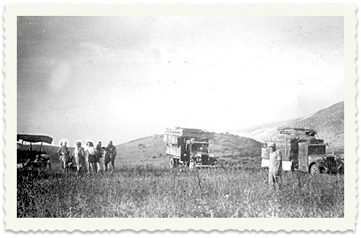 בין השנים 1929-32 משתלבים החלוצים במחנות בחדרה ובנס ציונה. הגרעין היגוסלבי מגיע למשמר העמק. עד שנת 1933 מתאחדות שלושת הקבוצות במושב מגדיאל וביוני 1935 הן עוברות יחדיו לגבעת חרתיה, לא הרחק מהגשר על הקישון אל מול הכרמל, שם שוכן שער העמקים עד היום. בתצלום: מביאים במשאיות את הצריפים הראשונים לנקודת הקבע.