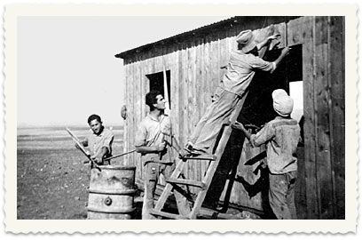 בניית צריף במחנה הקבוצה במשמר העמק (1932). המצולמים: הלל לבני, אברהם דוויצו, קלמי, יצחק שלזינגר. בתצלום למטה: המחנה במגדיאל (1932), לימים חלק מהוד השרון.