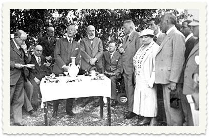 ב- 30 אפריל 1935 נערכות נטיעות בחרתיה, ע"ש מלך יגוסלביה אלכסנדר. (בתצלום סר ארתור ווקוף, הנציב העליון, ולידו אוסישקין ונציג ההסתדרות הציונית שהגיע מיגוסלביה):