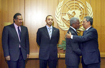 לפני הדיון. מימין: עמרו מוסא וקופי אנאן (צילום: איי.פי)