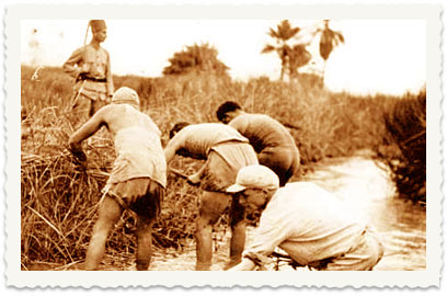 עבודת ייבוש הביצות. לאורך הגלבוע נוקזו כל הנביעות בתכנון מהנדסי קק"ל ובביצוע של חברי עין חרוד.