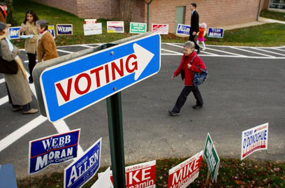 שלטי תעמולה ליד תחנת הצבעה בוירג'יניה (צילום: סי"צ)