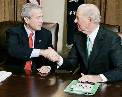 ג'יימס בייקר מגיש את הדו"ח לנשיא בוש (צילום: רויטרס)