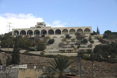 נצא אל המרפסת הענקית עם הנוף אל העיר העתיקה. מכאן ניתן להבחין בכל העיר העתיקה ובמרכזה כנסית הקבר ברובע הנוצרי, הר הבית על מבניו וגם במגדל ימקא ומלון המלך דוד שבעיר החדשה ממערב. בהמשך החצר ניתן להבחין במעין סבכות עץ בשביל צל עשויות עץ בורמזי ובכינויין "מוּשרבּייה". המתחם כולו מלא בשיש איטלקי, זכוכית אירופאית, עץ אלון, עוגב מדנמרק ובקיצור קיבוץ גלויות. כאן בחצר יש מספר דגמים בצבע אפור כשכל אחד מראה את ירושלים בתקופה אחרת מהעבר.