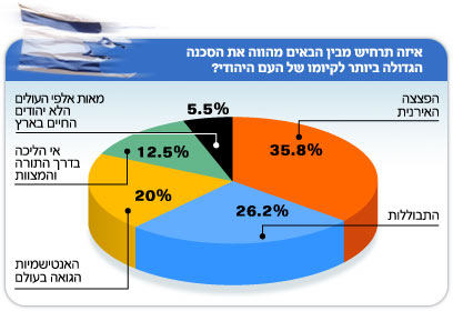 בנוגע לעתידו של העם היהודי – 36% מהנשאלים השיבו כי הפצצה האיראנית היא הסכנה הגדולה ביותר להמשך שושלת אברהם אבינו. 26% חוששים מההתבוללות, 20% מהאנטישמיות הגואה בעולם ו-12% מאי הליכה בדרך התורה והמצוות. כאשר פורטים זאת לתפישות דתיות מתברר כי יותר מ-45% מבעלי הדעה הדתיים והחרדים דואגים בעיקר מהתבוללות, ולעומתם 46% מהחילונים נאמנים יותר לסדר היום הביטחוני, וחוששים מאיומי אחמדי-נג'אד.