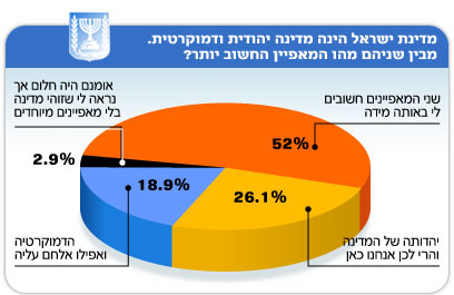 כמחצית מהציבור היהודי בישראל סבורים שהיהדות והדמוקרטיה הם מאפיינים שווים בחשיבותם במהותה של מדינת ישראל - כך עולה מסקר מכון "מותגים" שנערך עבור ynet יהדות ועמותת גשר ומתפרסם הבוקר (יום א'). עוד מתברר כי 26% מהציבור סבורים שיהדותה של המדינה קודמת לדמוקרטיה, כ-19% חושבים שהדמוקרטיה היא שעולה בחשיבותה וכשלושה אחוזים מהאוכלוסייה גורסים כי החלום ליצור מדינה יהודית-דמוקרטית התנפץ, ובפועל אין מדינת ישראל שונה מאחרות.