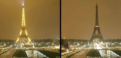 הלב הפועם של פריז, מגדל אייפל, החשיך הערב (ה') את כל פנסיו למשך חמש דקות, כדי להעלות את המודעות העולמית לשימור האנרגיה וההגנה על הסביבה.