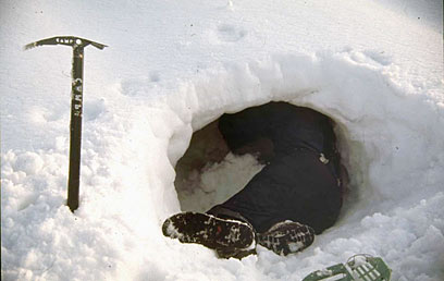 אז הלכנו. ומעט לפני שהעריב, הוצאנו את אתי החפירה שהבאנו איתנו מבעוד מועד ותקענו אותם בצלע הנחל. כי שם, ליד מדרונות (ועדיף הצפוניים), מצטבר השלג העמוק והטוב ולתוכו התחלנו לחפור. כי לישון בחוץ, להקים אוהל על השלג, חשופים לרוח ולטמפרטורות היורדות, אפשר אבל לא נורא מוצלח, ולעומת זאת מתחת לשלג אין הטמפרטורה יורדת אף פעם מתחת לאפס מעלות. ככה זה. לשלג יש כבוד והוא לא משתנה לא משנה לאיזה עומק אתה חוצב בו. גם 13 שנה למטה לא תמצא בו רבב.
