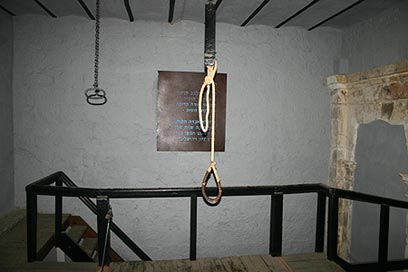 בשני התאים בכניסה לחדר הגרדום שהו הנידונים למוות בלבוש אדום. בתקופת המנדט הוצאו כאן להורג כ-100 איש, אף אחד מהם לא היה יהודי. אסירי המחתרות שנידונו למוות נשלחו לעכו שהייתה עיר ערבית, בכדי למנוע מיהודי ירושלים להתקומם.