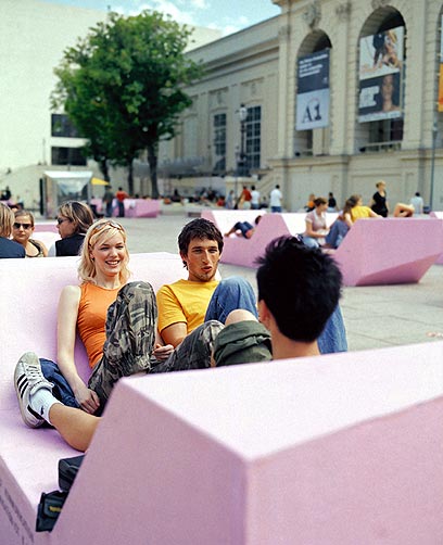 יחד עם החצר הפנימית שלו מהווה רובע המוזיאונים מרכז תרבות תוסס ופעיל. בחצר המרוצפת פזורים ספסלים צבעוניים בצורות גיאומטריות מוזרות, אשר מדי כמה חודשים נצבעים מחדש בצבע אחר, ועמוסים בצעירים וינאים שיושבים עליהם (בתנוחות מוזרות, יש לציין, כפי שהספסל מחייב). ב-MQ אפשר לבלות שעות, לקחת קפה מאחד מהדוכנים הפזורים וליהנות מהאווירה התרבותית במקום, בעיקר אם מזג האוויר נעים.