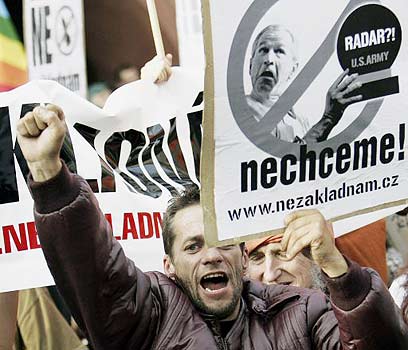 את פניו של בוש בפראג קידמה הפגנה של מאות אזרחים המתנגדים ליוזמה האמריקנית להציב חלק ממערכת ההגנה על אדמת צ'כיה, והאישור שנתנה ממשלת צ'כיה למהלך. המפגינים התעמתו עם השוטרים ונשאו שלטים עליהם נכתב "הרדאר מסריח ממוות".