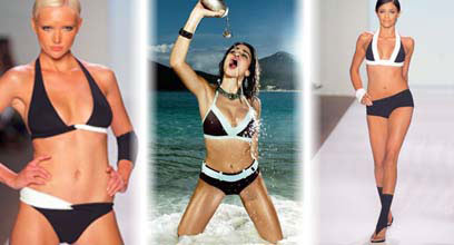 - בתמונות: מימין - גזרה מושלמת. אני הייתי בוחרת בצבע מתון יותר; במרכז - גזרת סטרפלס מוחצת את החזה, אבל התחתונים בגזרה רחמנית; משמאל - בגד ים לבן לבעלות גוף חטוב ושיזוף מושלם.