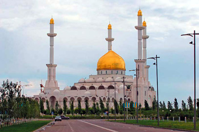 מרחוק זה נראה כמו ארמון הסולטאן בעלי באבא ו-40 השודדים, שצופה למדבר מפאתי העיר אסטנה, אבל כשמתקרבים אל כיפת הזהב והצריחים הנוצצים, מתברר שמדובר במסגד גדול ומושקע במיוחד. קירותיו הגבוהים, הצבועים לבן, מעוטרים בקשתות גדולות, ובחוץ משכשכים מים במזרקה ענקית.