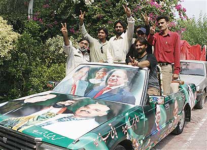 שריף מוקף בתומכיו לאחר נחיתת המטוס בפקיסטן (צילום: AP)