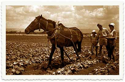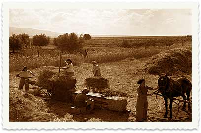 1. כיבוש חבילות חציר בעזרת מכבש חבילות שהופעל על ידי סוס