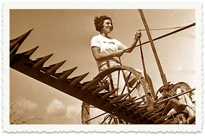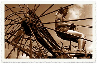 2. פועלת על גבי מגוב לאיסוף החציר הנגרר על ידי סוס