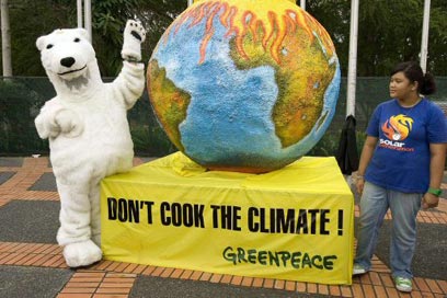 פעילים של "גרינפיס" מפגינים מול אולם כינוס הפתיחה של הוועידה (צילום: AFP)