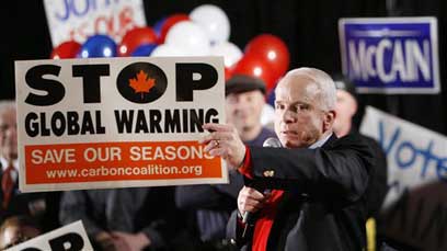 מקיין הרפובליקני הוא אחד המחוקקים הסביבתיים הבולטים בארצות הברית, שיזם כבר בשנת 2003 את החוק הראשון בסנאט הקורא להגביל את פליטת גזי החממה ממפעלים. (המצע הסביבתי של מקיין)