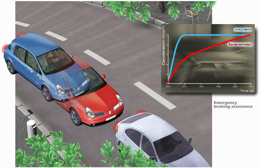 השפעת מערכת סיוע לבלימה - המכונית האדומה ללא המערכת, הכחולה עם (לחצו כאן להגדלה)