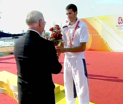 שחר צוברי מקבל את המדליה מאלכס גלעדי (צילום: ערוץ 1)