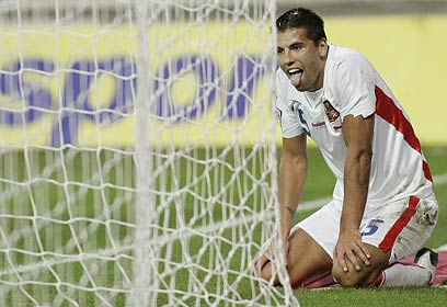מילאן בארוש מוציא לשון מול השער הסלובני (צילום: AP)