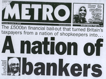 לונדון לא עיכלה מיד את מלוא המשמעות של תכנית ההצלה, אבל הביקורת היתה מאופקת. כמה עיתונים נתפסו בהגזמה לעניין ההלאמה וחששו כי האזרח הקטן נדרש לשלם מכיסו את מחיר הצלת הבנקים הכושלים. אבל גם בעניין זה לא נפקד מקומו של ההומור האנגלי, כשאחת הכותרות הראשיות הכריזה שהתכנית הופכת את משלמי המסים מ"אומה של חנוונים לאומה של בנקאים".