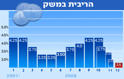 נגיד בנק ישראל, סטנלי פישר, הוריד את הריבית ל-2.5% - שיעור הריבית הנמוך ביותר מאז ומעולם בישראל. זאת, על רקע התמתנות האינפלציה, וההאטה המתרחשת במשק בצל המיתון בכלכלות המדינות המפותחות