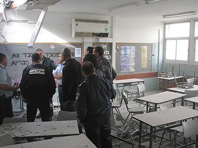 צוותי ביטחון אומדים את הנזק באחת מכיתות בית-הספר (צילום: רגב כלף)