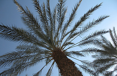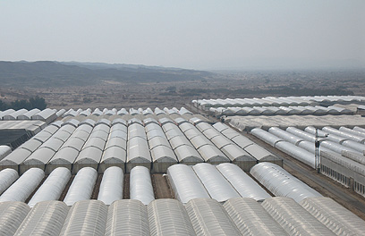 נעלה למצפור חופירה ומכאן נערוך תצפית מרשימה על שטחי החקלאות של מושב עין יהב — ים של חממות לגידול פרחים וירקות על רקע מטעי התמרים.