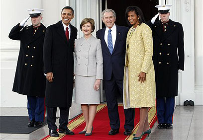 נשיא הולך ונשיא בא. אובמה, בוש והרעיות (צילום: AP)
