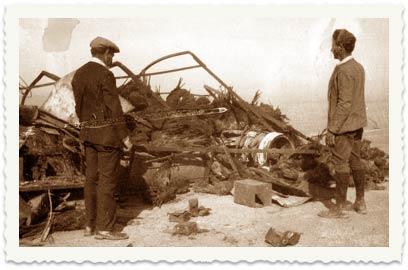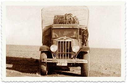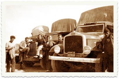 6. אחת המשאיות עלתה באש במהלך הנסיעה במדבר. בתצלום: עמרם רבר ובן ציון ניצבים ליד המשאית השרופה.