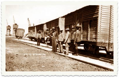 1. 1936, בתחנת הרכבת בבצרה, עיראק. מעמיסים את שתילי התמרים על קרונות הרכבת.