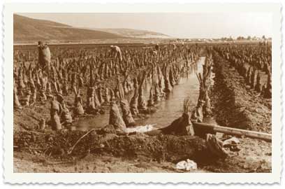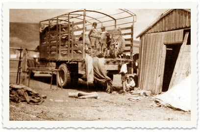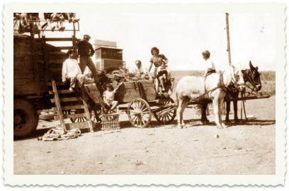 8. פריקת השתילים מהמשאיות לעגלת פרדות בכנרת. אהרוניק, בנו של בן ציון, יושב על כסא נצרים שהובא מעיראק.