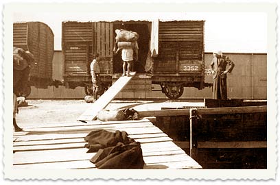 2. 1936, בתחנת הרכבת בבצרה, עיראק. מעמיסים את שתילי התמרים על קרונות הרכבת.
