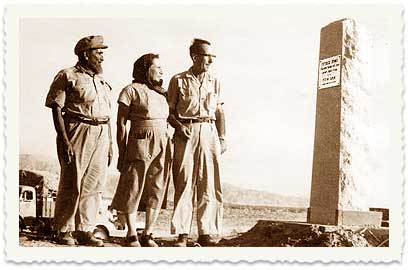 12. כאשר ניטע מטע התמרים בקיבוץ איילות, "נאות בן ציון", נחנכה במקום מצבה לזכר פועלו של בן ציון ישראלי. בתצלום משמאל: שמואל סטולר, חיה ישראלי (אשתו של בן ציון) ונחמן ירדני.