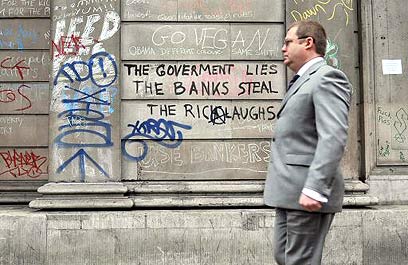 המפגינים ריססו גרפיטי על קירות הבנק המרכזי האנגלי. (צילום AFP)