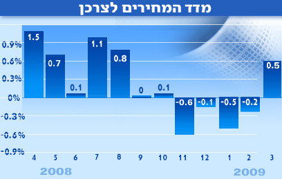 לאחר ארבעה חודשים של ירידת מחירים בצל המיתון - עלה מדד מרס 2009 ב-0.5% לעומת חודש פברואר. כך פרסמה היום (ג') הלשכה המרכזית לסטטיסטיקה. המדד הפתיע את ההערכות המוקדמות, שנעו בין יציבות ללא שינוי - לבין עליית מחירים של 0.2%. מתחילת השנה ירד המדד ב-0.1%, על רקע העלייה באבטלה, צמצום הייצור וצמצום הביקושים.