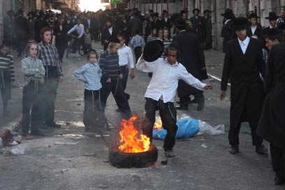 בשעות הצהריים הבעירו עשרות חרדים פחי אשפה בכיכר השבת וברחובות בר-אילן ויחזקאל וחסמו את התנועה בכבישים. כוחות משטרה הוזעקו למקום, ושוטר מג"ב נפצע באורח קל בידו כתוצאה מיידוי אבנים. חרדים יידו אבנים גם בשדרות בר לב. נזק נגרם לכמה כלי רכב ואוטובוסים.