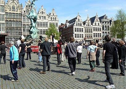 09:00. היכנסו לעיר העתיקה, לכיכר המרכזית שבה מזרקה עם פסל של צעיר המשליך כף יד גדולה. אגדה בלגית עתיקה מספרת שבימי הרומים ניצב לו הענק אנטיגון בפתח נמל העיר וחסם את כניסת הספינות בידו, עד שבא סילביוס ברבו, כרת את יד הענק, השליך אותה לנמל השני בגודלו באירופה ועל הדרך גם העניק לעיר את שמה: ANT = יד, WERP = להשליך. כף היד הכרותה משמשת עד היום סמל העיר.