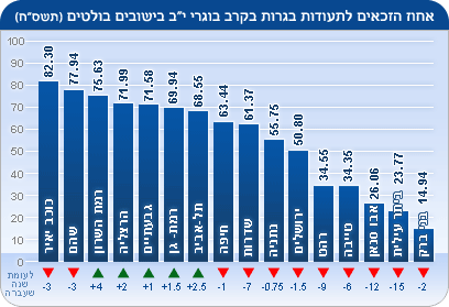 ברמת-גן אחוז הזכאים עומד על 69.94, אשקלון 69.58, תל-אביב-יפו 68.55, כפר-סבא 66.95, אשדוד 65.36, חיפה 63.44, ראשון-לציון 62.55, פתח-תקווה 62.14, חולון 61.79, דימונה 61.64, שדרות 61.37, רחובות 59.63, בת-ים 58.99, קריית-אתא 56.3, נתניה 55.75, באר-שבע 55.04, קריית-שמונה 54.19, נהריה 53.92, קריית-ביאליק 53.05, ירושלים 50.8.