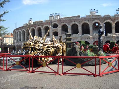 מושבי האמפיתיאטרון נחצבו בשיש ורוד, בלבנים ובאבנים ענקיות, ובנייתו הושלמה כבר במאה הראשונה לספירה. ביום שבו ביקרנו במקום המרשים הזה, שהשתמר להפליא, נערכו הכנות אחרונות לאופרה "אאידה". הכרטיסים אזלו, ונאלצנו להסתפק במראה הנוף הנהדר הנשקף מסביב משורת המושבים הגבוהה ביותר באמפיתיאטרון. ה"ארנה" צמודה לאחת הפיאצות הגדולות והמרשימות של ורונה, "פיאצה ברה" (Piazza Bra).