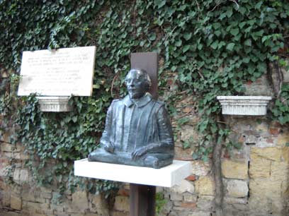 פסלו של שייקספיר בהיכל קברה של יוליה. האיטלקים העניקו לו כבוד