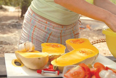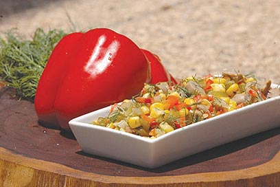 - קולפים וחותכים את כל הירקות, מניחים בקערה, מתבלים במלח, פלפל שחור ושמן זית ומערבבים היטב.