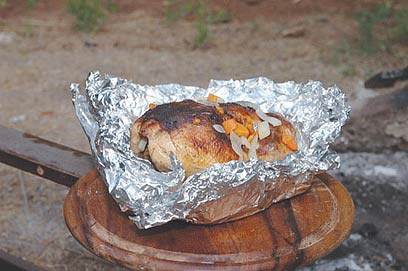- בסיום הבישול מוציאים את התבשיל העטוף מהאדמה, חותכים בעדינות את נייר הכסף (בזהירות, בבקשה, שלא תשפכו יותר מדי חול ועפר על העוף) ומשתדלים לא להיבהל מהאדים שמשחרר נייר הכסף ומחומו הלוהט של המטפונה.