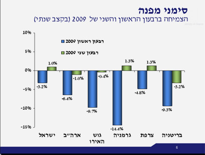 שטייניץ אמר בישיבת הממשלה: "בחודשיים האחרונים אנחנו רואים גידול ביצוא, גידול בגביית המסים, גידול באמון הצרכנים, המדד המשולב חיובי פעם ראשונה מזה יותר משנה וניכרת התחלה של צמיחה. חלק משמעותי במגמת השיפור נובע ממקורות כחול לבן, והעדות לכך היא כי על אף שהייצוא וההשקעות הזרות עדיין לא חזרו לקדמותם, אנו כבר רואים את סימני הצמיחה.