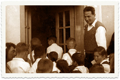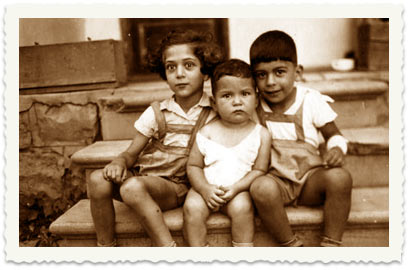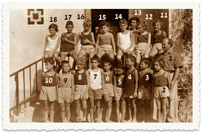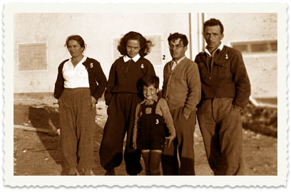 9. 1935, על מדרגות בתי הקואופרציה מרחביה, מימין: אביעזר יערי, בן אנדה ומאיר; יורם מן, בן משה וצילקה; רותה וינטראוב, בת דורה ורישרד.
