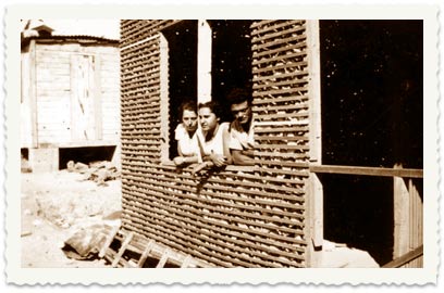 11. "בית בוץ". איני יודע אם הייתה זו המצאה של מרחביה, אבל בשנים הראשונות היה מחסור בחומרי בנייה ובכסף. לפיכך בנו צריפי בוץ: קיר סנדוויץ' של רשת ומקלות עץ, ובתווך אבנים ובוץ. לידיעתכם, הצריפים שלא פורקו עומדים איתן עד היום. בתצלום נראה הסנדוויץ' לפני טייח. בחלון קובה פרנס עם אשתו חנה ואחותה יטקה.